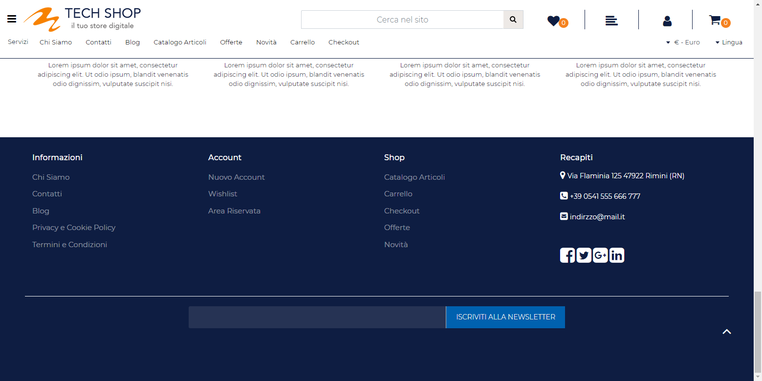 Piede di Pagina su 4 colonne, 3 per menu e 1 per Recapiti e pulsanti Social. Riga aggiuntiva con componente per iscrizione alla newsletter