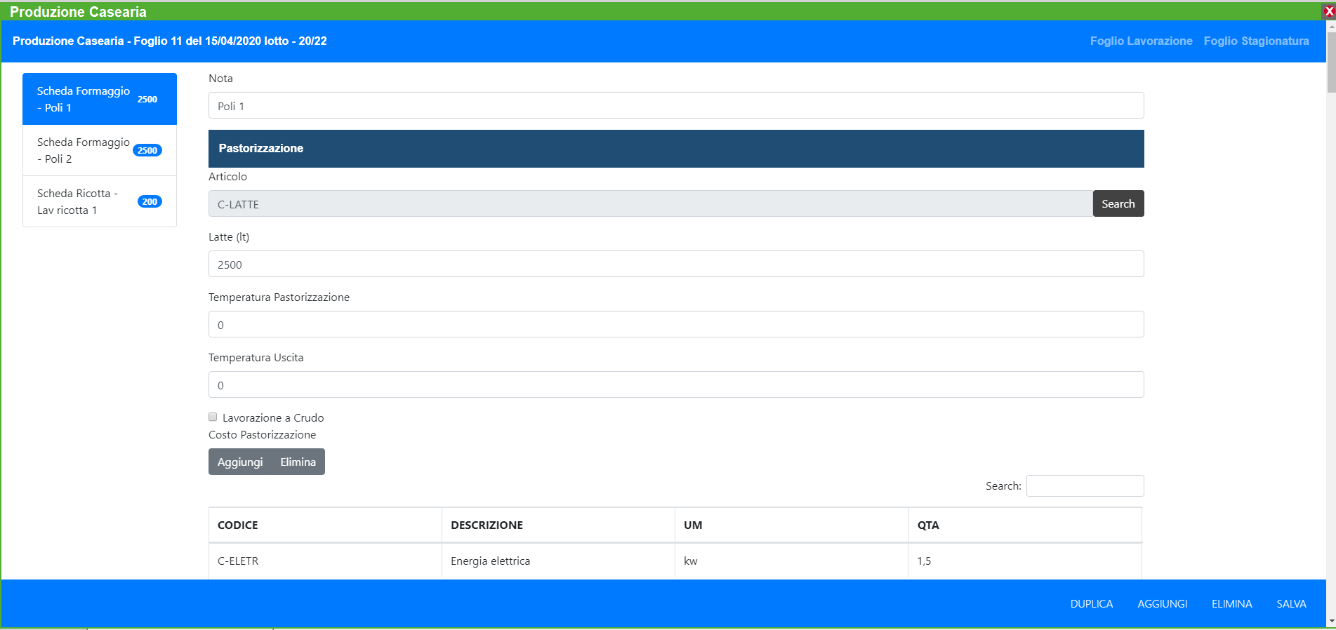 Verticale per gestire le fasi di produzione casearia con l' inserimento di tutti i costi di lavorazione, il tempo di stagionatura con la rilevazione dei cali progressivi e loro valorizzazione.