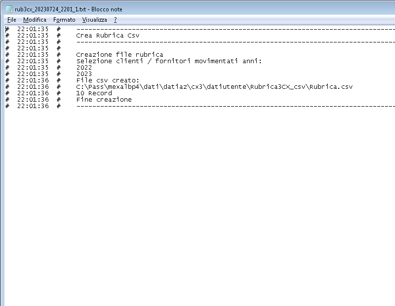 relativa voce di menù), la creazione del file csv nella cartella inserita in