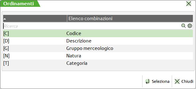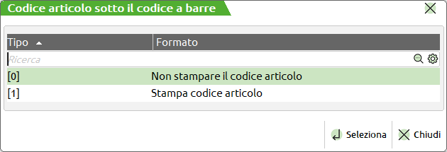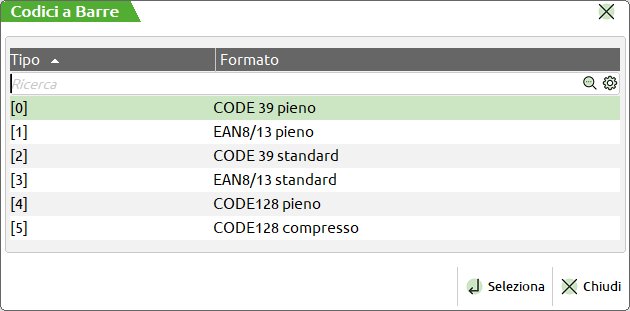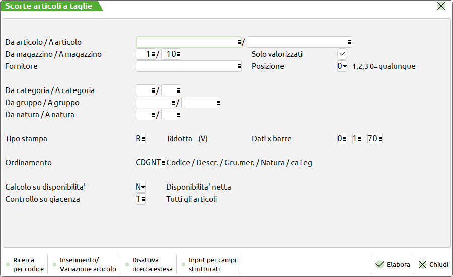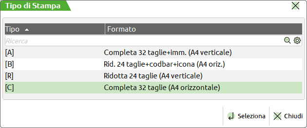 La procedura permette di stampare l'elenco degli articoli a taglie con esistenza e disponibilità netta o lorda. La stampa si può effettuare in quattro formati: completa, in formato A4 orizzontale con il riporto di 32 taglie, ridotta, in formato A4 verticale, con 24 taglie, con immagine catalogo, con immagine icona e codice a barre.