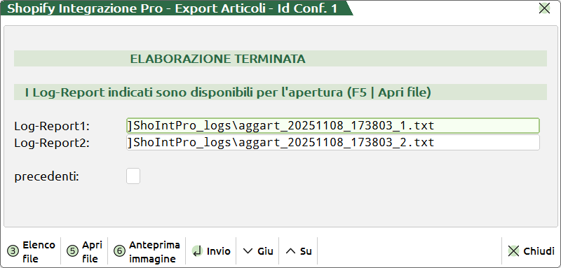 Al termine di un'eventuale elaborazione avviata manualmente, apertura finestra con possibilità di apertura dei files log-report.