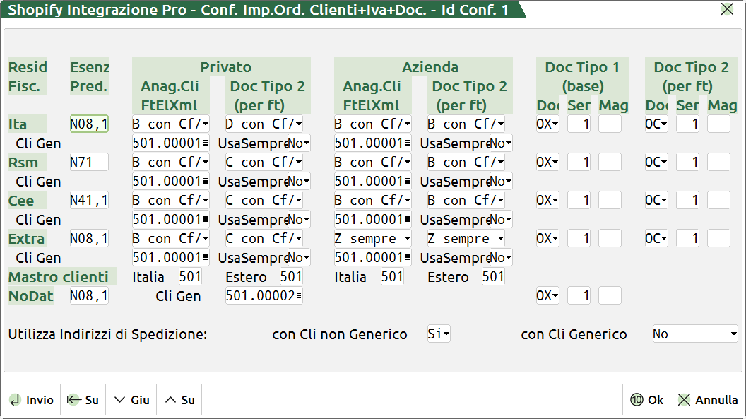 Import Ordini, nuova gestione per impostazione Fatturazione Elettronica cliente ed eventuale diverso documento per Fattura, ora entrambi configurabili a seconda della Residenza fiscale, se Privato/Azienda, dei Dati Fiscali presenti, dell'origine di tali dati su Shopify.