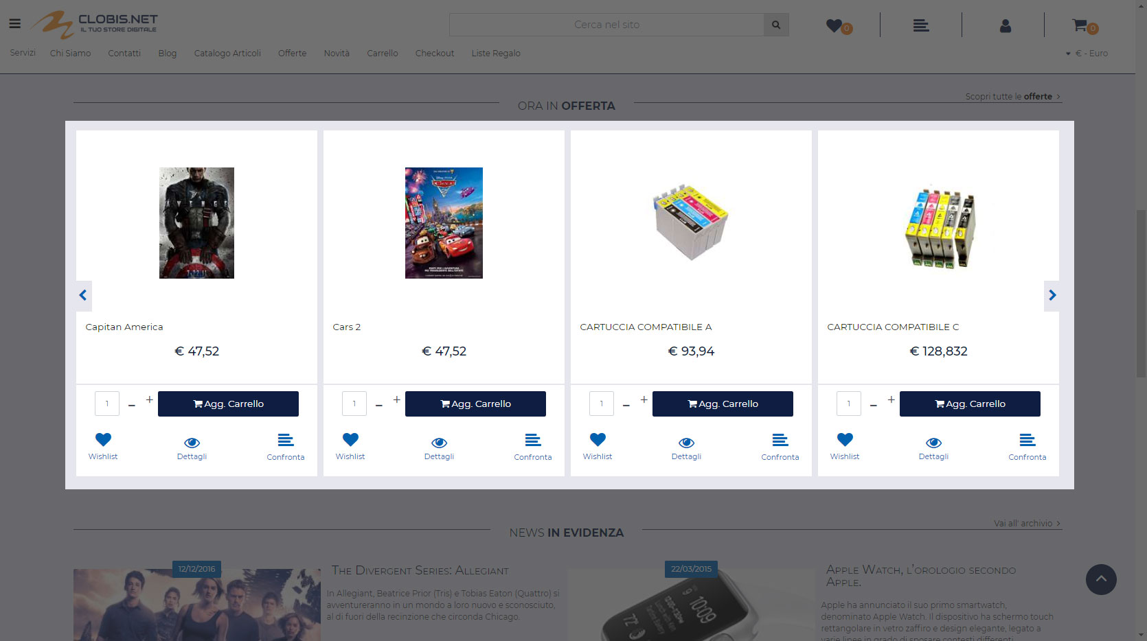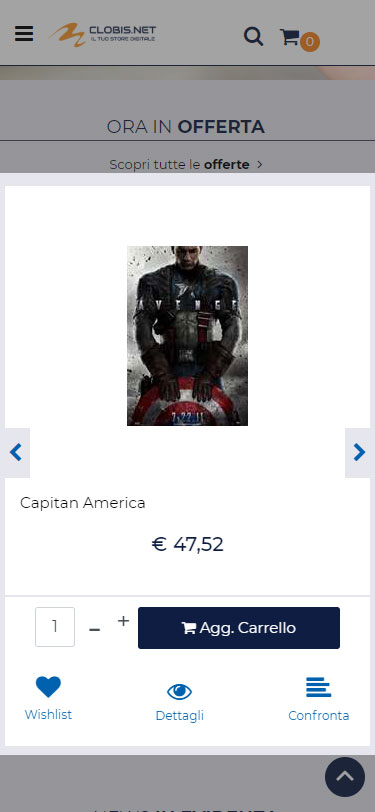 Slider Offerte/Novità con quickview per visualizzazione dettagli prodotto. Scorrimento con puslanti di avanzamento (precedente e successivo)