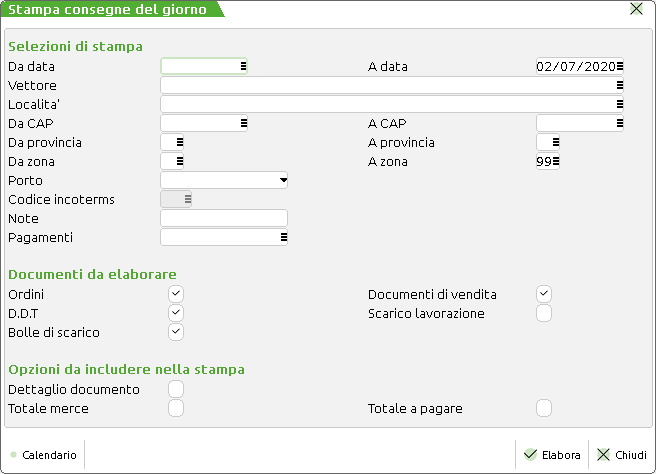 E' inoltre possibile decidere se stampare il dettaglio dei vari documenti piuttosto che il totale della merce da spedire o il totale da incassare.