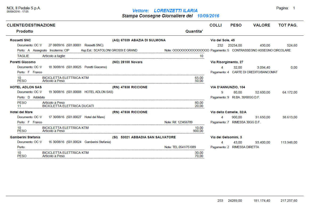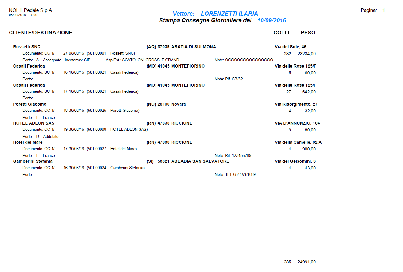 L'applicazione consente di effettuare una stampa previsionale delle consegne giornaliere divisa per vettore e data.