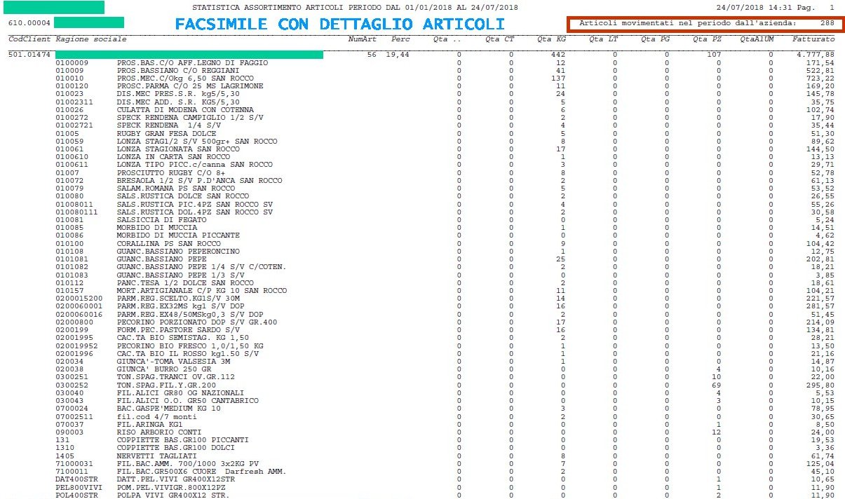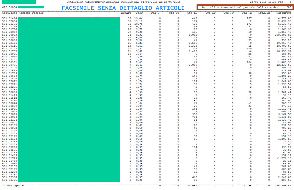 evidenziando anche l’incidenza % rispetto al totale aziendale degli articoli