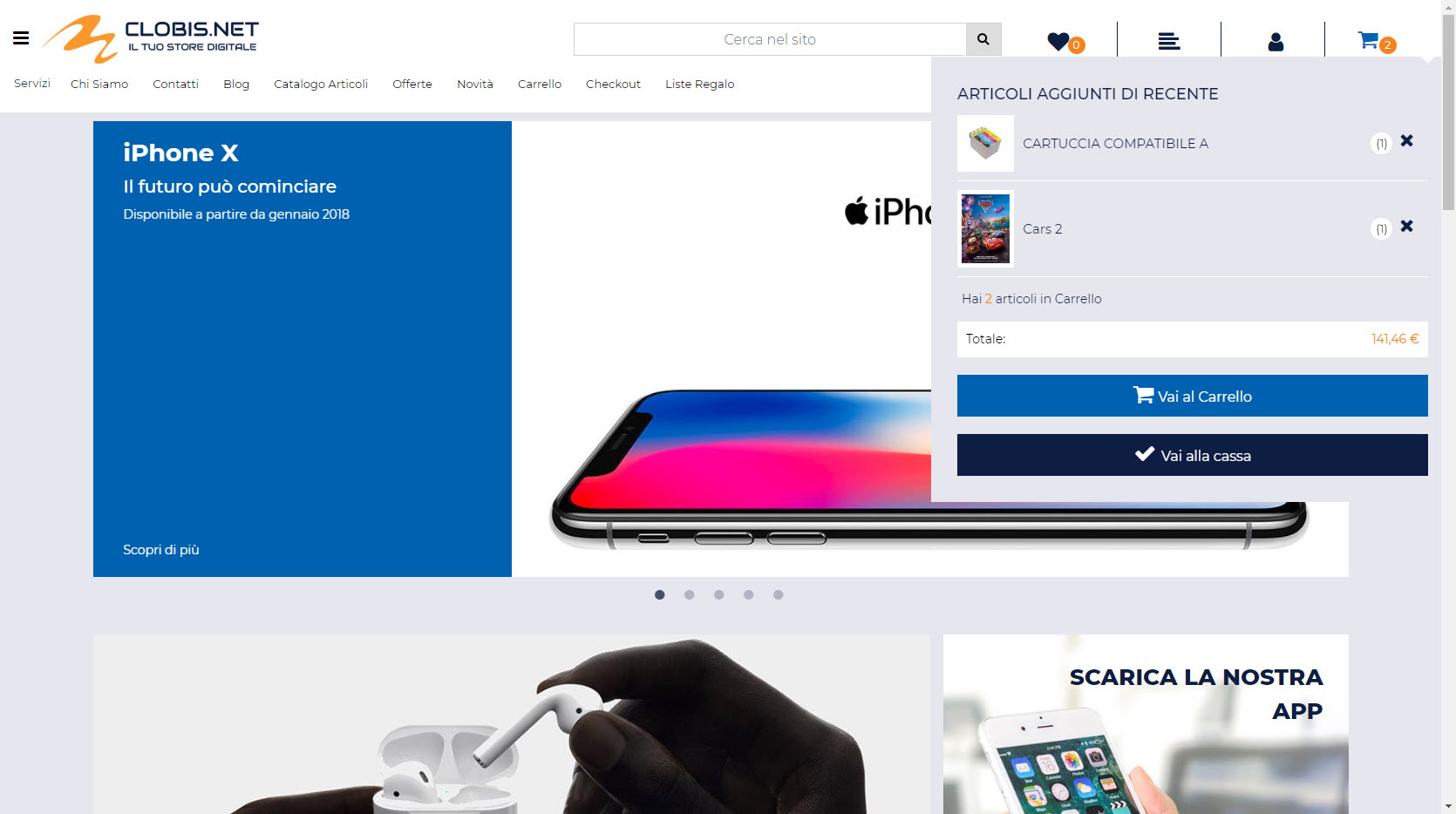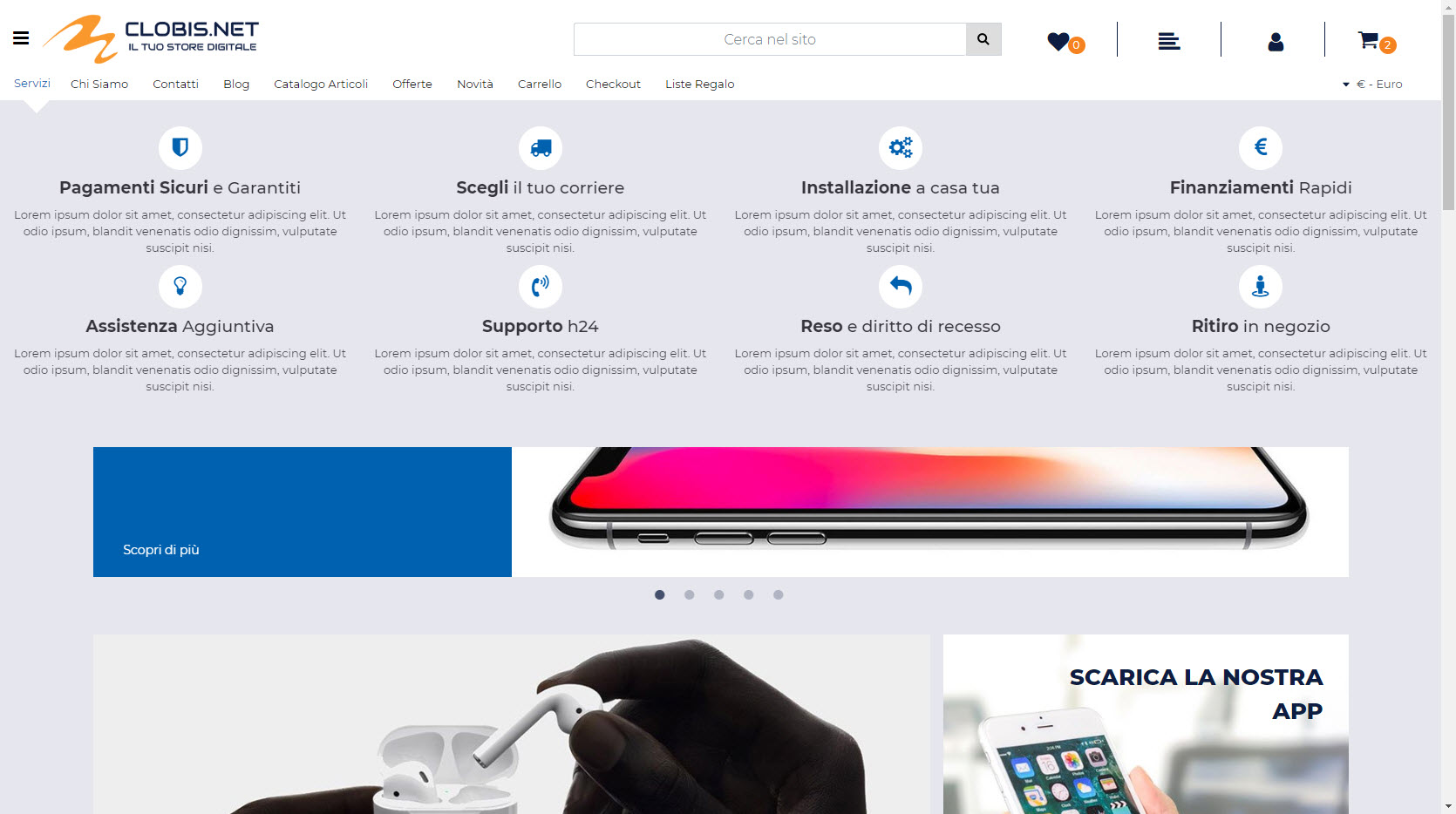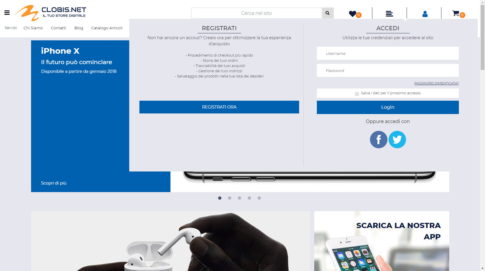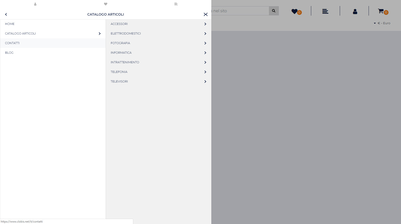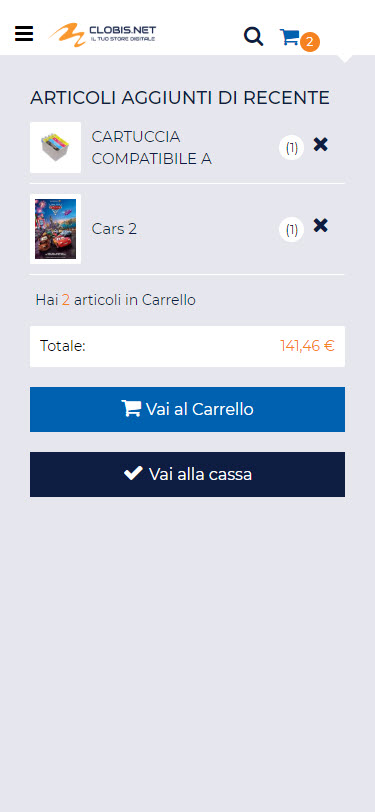 Testata Sito con menu di navigazione Offcanvas, menu di navigazione orizzontale con prima voce in megamenu, mini carrellino, mini wishlist, mini comparatore, pannello di ricerca testuale e pannello di accesso al sito collasabile.