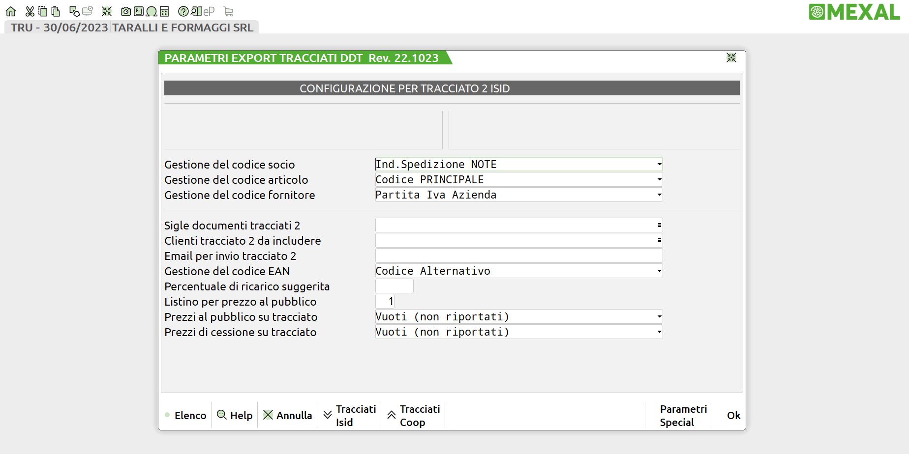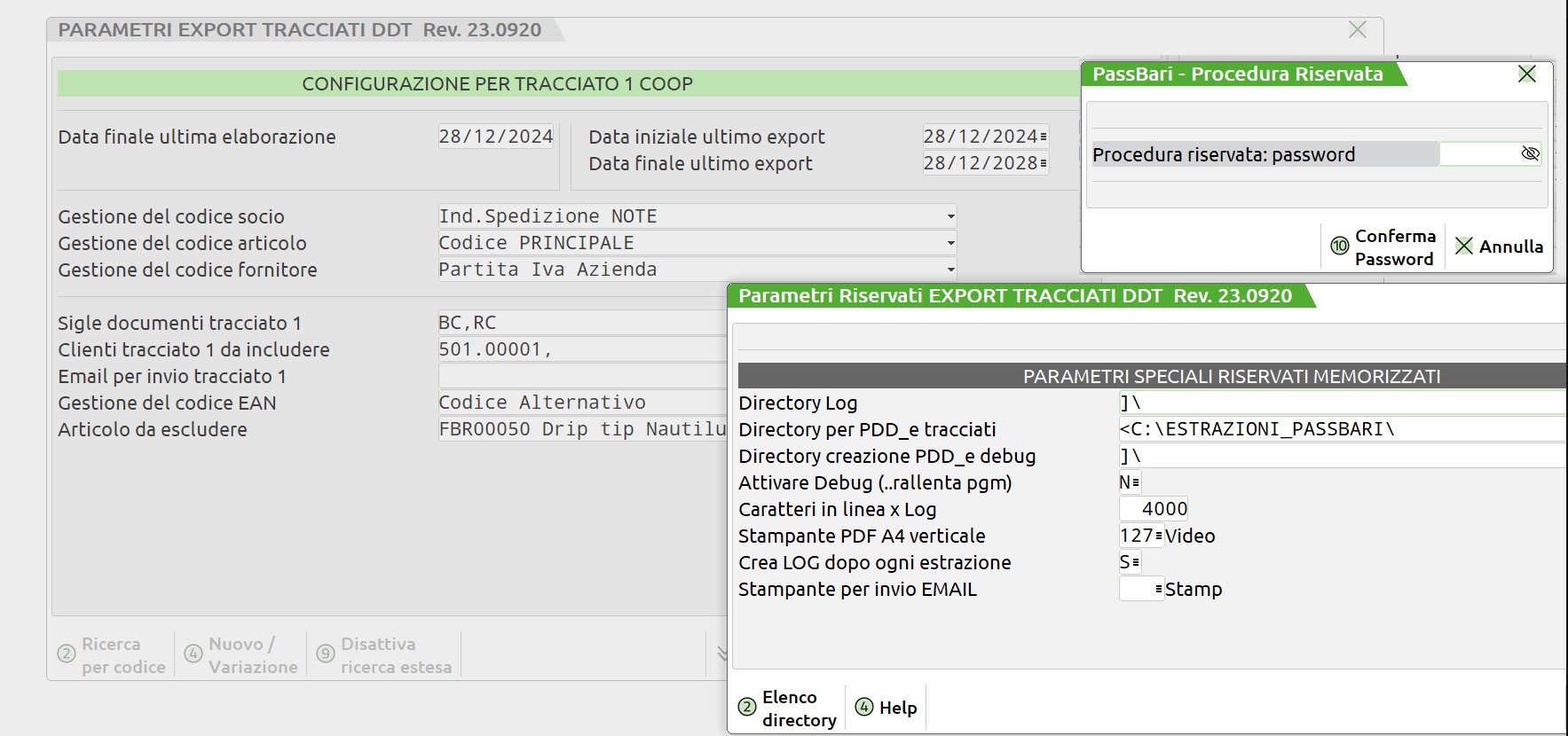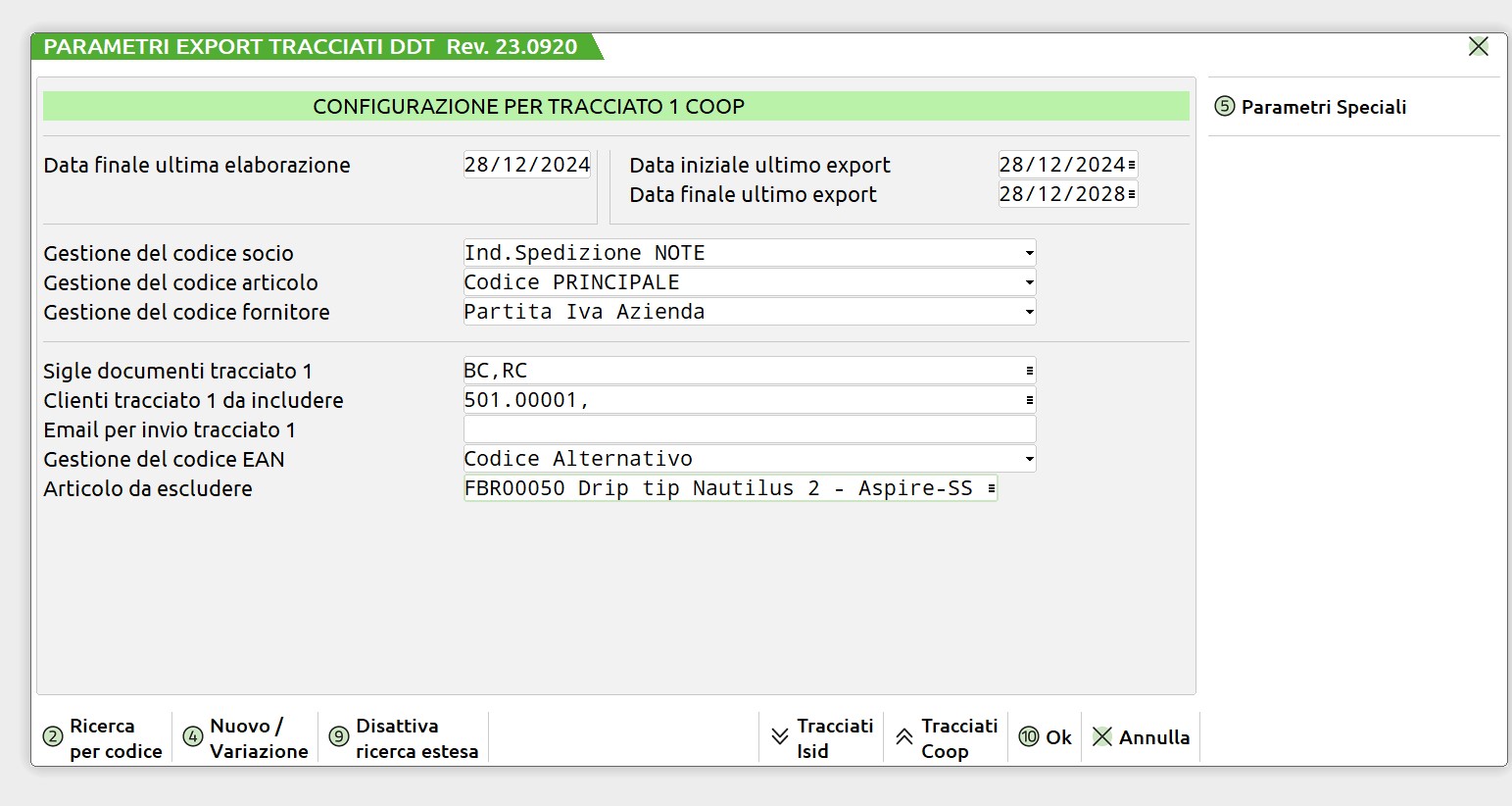 Permette di estrarre giornalmente i file dei tracciati elettronici riferiti ai ddt emessi verso i soli clienti del gruppo COOP o clienti del gruppo ISID (Numeri primi) o del gruppo COSMO. L'app permette tre modalità di estrazione tracciati DDT: 1) automaticamente al termine di ogni inserimento DDT; 2) manualmente al termine della giornata, indicando solo la data di riferimento; 3) automaticamente in serata con estrazione giornaliera da Operazioni Pianificate. Permette di gestire contemporaneamente più clienti COOP, ISID e COSMO