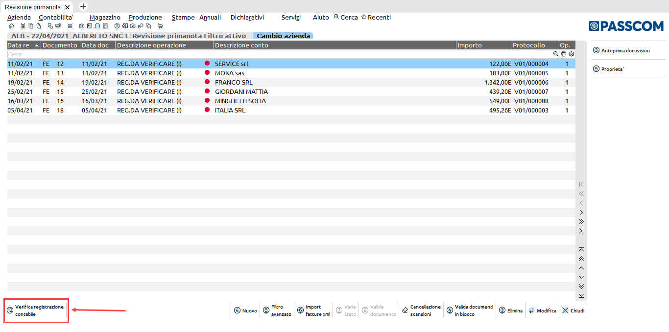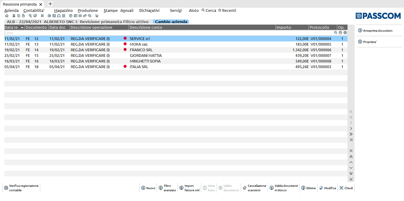 La funzione permette di impostare lo stato di verificato sulle registrazioni presenti in ‘Revisione primanota’, identificate da un bollino di colore rosso, senza dover entrare in variazione delle stesse.